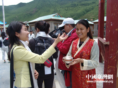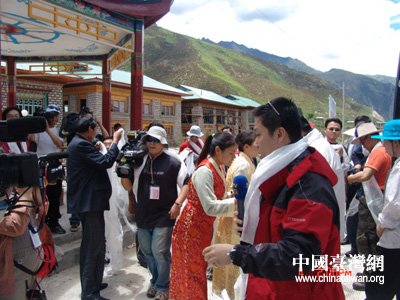 在现场,来自台湾的东森电视台、中天电视台等媒体都把藏民的这种欢迎仪式拍摄下来,准备介绍给岛内的民众,让岛内民众能更充分地了解藏族同胞的风俗民情。(谢晓萍)