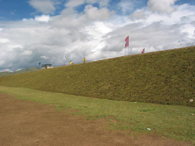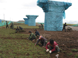 9月2日,青铁建设山南藏族民工正在回植草皮。中铁五局青藏二项目部去年成功地进行了草皮移植试验,在青藏铁路桥梁施工中,桥墩成型后,及时回植草皮,当地村民称桥墩如拔地而起的竹笋。青藏铁路建设所经过的无人区、藏北草原等地区植被极为脆弱,一旦遭到破坏很难得到恢复。铁路建设者请教各方专家和当地有经验的牧民,修路时首先把原有的草皮掀开另行养殖,待路基完成后再把草皮移植回边坡,使草皮植被成功恢复。 秦世祥摄来源:新华网