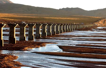 9月25日,青藏铁路沱沱河段长江源头第一特大桥从清澈的河流上跨过。青藏铁路建设用于环保方面的投资达到20亿元人民币,约占工程总投资的8%。有“世界屋脊”之称的