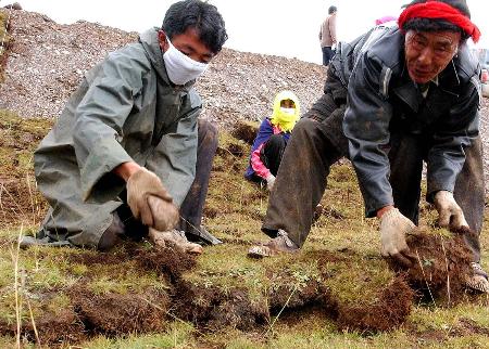 9月15日,西藏当雄县的牧民在青藏铁路路基边坡上移植草皮。青藏铁路建设用于环保方面的投资达到20亿元人民币,约占工程总投资的8%。有“世界屋脊”之称的青藏高原生态环境十分脆弱。青藏铁路建设单位通过移植草皮、设施工便道、建立珍稀动物观察站和环保监理等措施保护青藏高原的植被、动物、水质和自然景观。 新华社记者 格桑达瓦摄