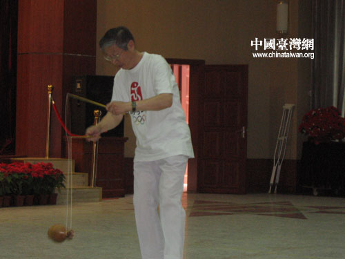 中国台湾网7月13日北京消息 今天上午,台湾莺歌高职扯铃队参观了北京市丰台二中,并与二中的学生,分别进行了抖空竹表演。在演出现场,本网记者就两岸空竹艺术的发展特色专访了北京玩具协会空竹委员会副主任刘振钰老先生。