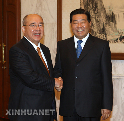 2008年5月27日,中共中央政治局常委、全国政协主席贾庆林在北京钓鱼台国宾馆会见来访的中国国民党主席吴伯雄。 新华社记者刘卫兵摄