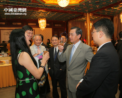 8月27日,中共中央台办、国务院台办主任王毅在钓鱼台国宾馆举行欢迎酒会,欢迎前来北京出席台商座谈会的台湾工商界人士和大陆台商代表。这是出席酒会的台湾工商界人士和大陆台商代表向王毅主任敬酒。