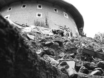 受持续强降雨的影响,田螺坑土楼群于数日前开始出现楼群护坡变形,多处山体滑坡,并最终造成瑞云楼下方的挡土墙发生大面积坍塌,对土楼地基构成严重威胁(见左图)。目前,国家文物局研究所已经派出专家组抵达现场勘察,研究制定详细的抢救方案。