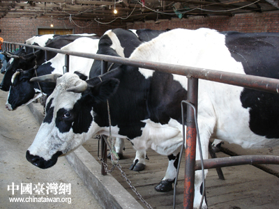 台湾记者想要看看机器挤奶,尽管还不到挤奶时间,吴常胜也大方的满足了远到而来的朋友提出的要求。在主人的吆喝声中,奶牛乖乖的从露天的围栏里走进了室内的挤奶场。“这奶牛还会自己站好队伍啊。”一名台湾记者的惊叹令站在一旁的吴常胜会心一笑,他解释说,奶牛一天挤两次奶,上午一次,晚上8点一次,现在不到时间人又多,奶牛有点受惊,反而不愿进挤奶场了。“你看,那两头就不肯靠近呢。”吴常胜指着紧靠院子围墙离人群远远的两头奶牛说。