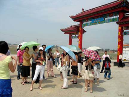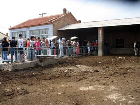7月16日,第二届中国网络媒体内蒙古行采访团记者在草原青城呼和浩特感受寺庙宗教文化后,来到了占地两万余亩的蒙古风情园,在这里采访团记者体验到蒙古族历史文化、军事文化、民俗文化、民间文化。中午,呼和浩特市委宣传部在这里为大家准备了丰美的午餐,就餐结束后,采访团记者几乎都没有休息就开始了下一个地点采访,2点30分,记者团冒着炎热来到了呼和浩特赛罕区金河镇舍必崖新农村奶牛示范养殖基地进行了采访。