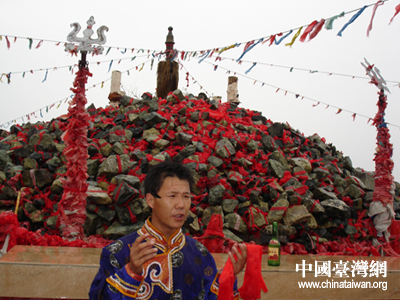 蒙族小伙子在向记者们介绍“敖包”的来历。敖包,又称“鄂博”、“石堆”、“鼓包”等,在蒙古牧人看来是神圣之所在。祭敖包是蒙古民族萨满教隆重的祭祀之一。