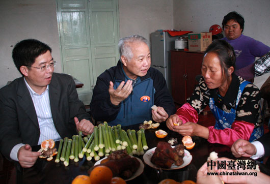 11月6日,亲民党副主席张昭雄率领出席两岸农渔水利合作交流会的53名台湾代表到上海崇明岛华西村考察。图为张昭雄与农户交谈。(中国台湾网 钟宝华 摄)
