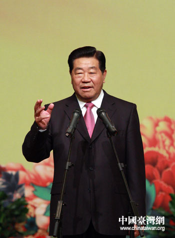 11月7日下午,中共中央政治局常委、全国政协主席贾庆林在宁波会见了亲民党主席宋楚瑜、新党主席郁慕明和出席两岸农渔水利合作交流会的台湾人士,并为与会人士设欢迎晚宴。图为贾庆林在欢迎晚宴上致辞。(中国台湾网 钟宝华 摄)