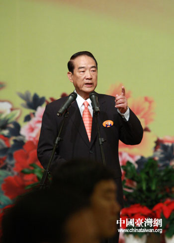 11月7日下午,中共中央政治局常委、全国政协主席贾庆林在宁波会见了亲民党主席宋楚瑜、新党主席郁慕明和出席两岸农渔水利合作交流会的台湾人士,并为与会人士设欢迎晚宴。图为宋楚瑜在欢迎晚宴上致辞。(中国台湾网 钟宝华 摄)