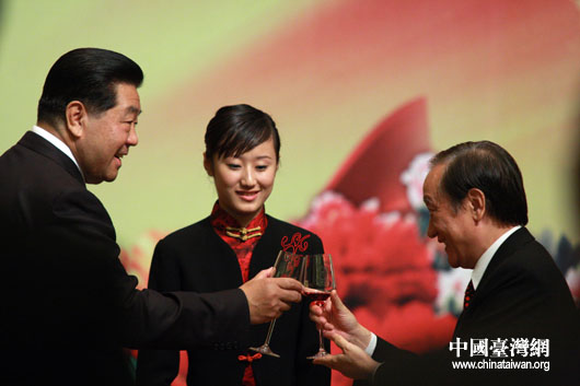 11月7日下午,中共中央政治局常委、全国政协主席贾庆林在宁波会见了亲民党主席宋楚瑜、新党主席郁慕明和出席两岸农渔水利合作交流会的台湾人士,并为与会人士设欢迎晚宴。图为贾庆林与郁慕明举杯致意。(中国台湾网 钟宝华 摄)