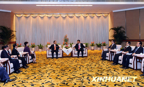 11月7日,中共中央政治局常委、全国政协主席贾庆林在宁波会见亲民党主席宋楚瑜、新党主席郁慕明和出席两岸农渔水利合作交流会的台湾人士。新华社记者 饶爱民 摄