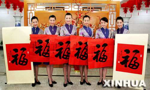 资料图片:2006年1月24日,厦门航空公司的6名空姐展示“福”字。1月25日,2006年两岸春节包机厦航首航班机抵达台湾后,这些“福”字将被赠送给台湾同行。新华社发(陈理杰 摄)