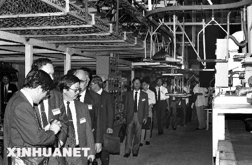 两岸经济交流合作20年来,在两岸同胞的共同努力下,两岸经济交流与合作取得了令人瞩目的成就。台商到大陆投资和两岸贸易已达到相当大的规模,两岸经贸交流日益热络。为鼓励和保护台商投资,祖国大陆制定了一系列法律法规和政策措施,为两岸经济合作搭建平台。截至2007年9月底,两岸间接贸易总额累计达6933亿美元,其中大陆对台出口1196亿美元,台湾对大陆出口5737亿美元,台湾对大陆贸易顺差累计达4541亿美元。从1989年到2006年的17年间,台商投资大陆累计金额增加了140多倍,大陆已成为台湾对外投资的最大目的地。 图为由台湾工商企业的董事长和总经理为主组成的台湾大陆贸易投资商务考察团到天津经济开发区考察(1990年6月30日摄)。 新华社发