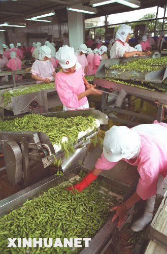 福建侨乡龙海市目前已引进150多家台资企业,其中有台湾10大财团中的4家,形成了电力、食品加工、制铁印罐、旅游房地产等几大台资支柱产业。其中,台资龙海冷冻食品有限公司是当年中国生产能力最大的保鲜冷冻果蔬加工出口企业。产品销往美国、日本等10多个国家和地区,年出口值1.34亿元。图为工人在加工出口青毛豆(1998年10月摄)。 新华社发