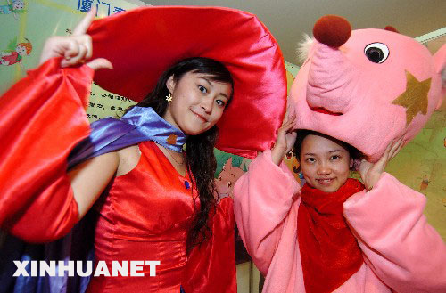 海峡两岸动漫展于2007年4月7日在厦门国际会展中心拉开帷幕,有20家台湾动漫企业与大陆的同行共同参展。图为两名女孩在海峡两岸动漫展上表演动画明星真人秀(2007年4月7日摄)。 新华社发