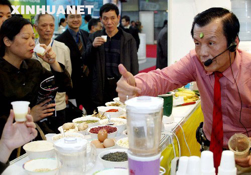 一位台湾参展商在第六届上海国际工业博览会上向参观者推介“好媳妇”营养调理机(2004年11月4日摄)。 新华社发 |