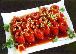 色泽红润,质地软嫩,兼有酸,甜,香,辣,咸五味,鲜香味美,异常适口。