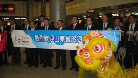 19:00 山航SC 4085航班平稳地降落在台北桃园国际机场,当于冲局长、孙述涛市长等走出飞机舱口时,受到台湾观光协会张学劳会长、台湾两岸观光协会谢谓君副会长等的热烈欢迎。台湾邀请单位在机场举行欢迎仪式,欢迎山东省旅游交流团等团组来台交流考察。