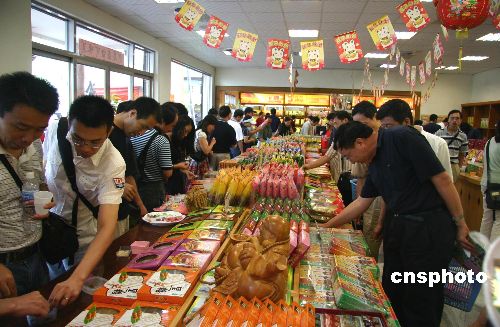 台湾的凤梨酥、麻薯等点心食品遐迩闻名,许多初到宝岛的大陆客热衷于选购这些土特产,作为馈赠亲朋好友的礼物。图为9月24日一个大陆出版界参访团在花莲的商店中选购麻薯。 中新社发 林国瑞 摄