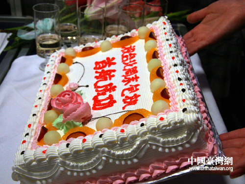 国航在两岸首航周末包机上准备庆祝蛋糕,祝台北周末包机首航成功。(摄影 李徽)