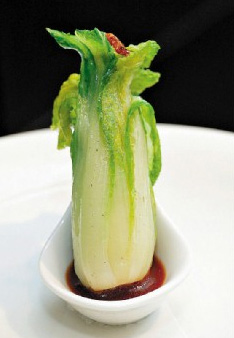 像是游客必看的翠玉白菜,斜倚在小碟子里,主厨萧广安选产自台湾中部的娃娃菜,整棵菜剥掉90%,只取中心叶菜层、长约8到10公分大小。先经过火腿、鸡高汤汆烫入味,之后可以淋上XO高汤酱汁热食、或搭配咸甜的芝麻酱汁当开胃冷食,主厨更以樱花虾替代螽斯和蝗虫,食趣十足。