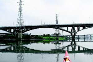 因为水质的影响,划舟者通常会选择溯入新店溪,而不愿往较脏的大汉溪操桨,从新店溪口向上游的第一眼,华江、华翠、万板、光复等新旧四道大桥,就聚建在二公里以内。101大楼则突出堤防的遮掩,鹤立鸡群地占据都会天际。