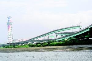 淡江、基河汇口向下游可以远眺红漆醒目的关渡大桥,绕过社子岛尾端湿地,马上就可以看到衬着雪山远景的重阳大桥,绕过了十数公里划程,城中区的新光三越大楼重新占据台北的天际线,接着是沟通台北县市大小不下十条的大桥。