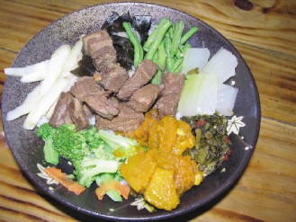 中新网10月19日电 据19日的台湾《联合报》介绍,台湾苗栗三义乡胜兴车站附近的“村居”,重现客家人俭朴饮食方式,并改良推出“复古海碗饭”,满满卤猪肉和时令蔬菜,覆盖在大碗白饭上,游客吃出饱足感,滋味更让客人称赞。