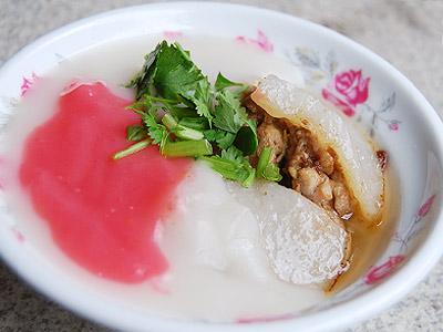 丁山肉丸皮Q馅料多,外皮采用旧在来米制作,经过熬煮、冷却再掺入树薯粉,Q软弹性佳,内馅特选温体猪后腿肉与大坑麻竹笋,当日新鲜食材、纯手工现做;炸的过程也非常重要,使用小火慢炸的肉丸,外皮愈炸愈有弹性,且炸油是老板自制的纯猪油,干净卫生也较不油腻;而搭佐肉丸的酱料更是不容忽视的关键,用旧在来米研磨成浆后,加入糖成白色的甜酱,掺小辣椒、味噌、酱油与五香粉即制成红酱,白酱和红酱都是让肉丸美味的重要因素。