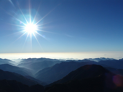 登顶的时候,天气非常好,向东望去,就是十峻之首的玉山东峰,狰狞的断崕岩石地形,气势非凡。远方的山峦间是急速翻搅奔腾的云海,在这里看来,却是如此平静,马博拉斯、秀姑峦山、大关山、新康山...等百岳,一做一做的从南到北浮在云上。南方与西方天际与山脉的交接处,云似乎是沈稳而安静的,水平的横卧在群峰之间,分成好几个层次,从淡到深、渐远渐轻,蒙蒙宁静的水蓝,像是国画的渲染技法,有种单纯的美感,细致而淡雅。