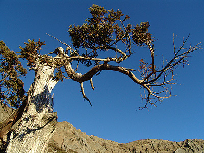 经过冷杉林,过了往主峰与南峰登山到的交叉口后,地形开始逐渐空旷起来,再往前就要进入碎石区了。碎石区主要的植物仍是以台湾圆柏为主,看的圆柏盘根错节的枝干,各种扭曲的姿态让人感到这种植物的坚韧生命力,穿过石缝的树根,就让圆柏硬生生的矗立在碎石恶地上。