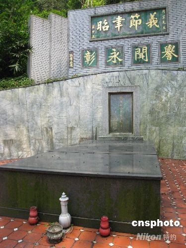 昔日上海滩大亨杜月笙之墓位于台北县汐止“秀峰国小”后山。蒋中正题“义节秉昭”、张群题“誉闻永彰”金色挽额,作为背景映衬灰黑色的墓碑。墓碑上刻有宋体楷书金字“先考杜公月笙府君之墓”。据记载,杜月笙一九五一年逝世于香港,一九五三年安葬于台湾。 中新社发 许晓青