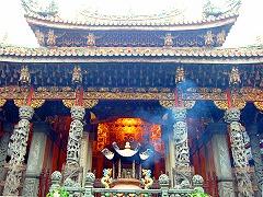 铜铸部分则可观赏庙内的8座塑像,钟鼓楼下4尊是四大金刚,其脚踏八魔、手持剑、琵琶、雨伞与蛇,象徵风调雨顺;中殿4尊是清水祖师的四大将,铜像神态威武,栩栩如生,令人望之生畏!