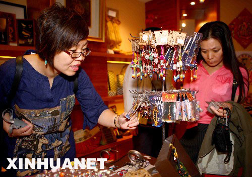 7月7日,两位来自北京的游客在阿里山森林生态公园一商店内选购纪念品。 大陆居民赴台旅游首发团抵达台湾后,开始奔赴台湾一些著名景点,在领略台湾自然景色的同时,开始抓紧时间为亲朋好友选购一些独具台湾特色的旅游纪念品。 新华社记者 陈建力摄