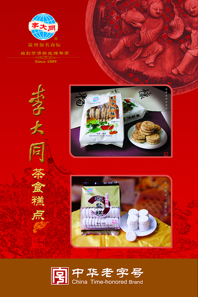 瑞安李大同茶食品店始创于清朝光绪十四年间(公元1889年),距今已有一百多年历史,创始人李瑞庆系浙南一带糕点名师,因仰慕孙中山先生“世界大同”精神,故取店名为“李大同”。经他和其子李锦淮两代人苦心经营,至二十世纪三十年代,“李大同”已成为浙南闽北一带首屈一指的大商号,其主要产品有双炊糕、面茶糕、芙蓉糖、空心月、芝麻巧等茶食糕点。甜、酥、软、韧、香是其主要特色。风味独特,视作浙南特产。