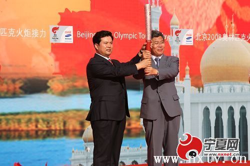 自治区主席王正伟将奥运火炬交给自治区党委常委、银川市委书记崔波。