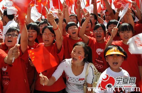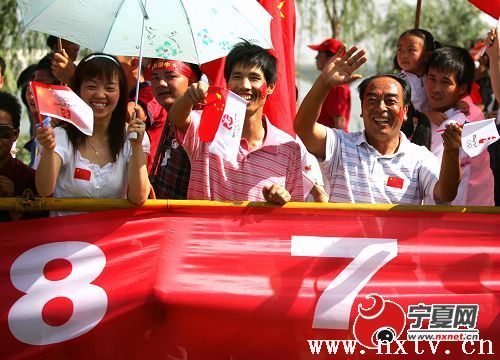 昨天清晨的凤城,丽日晴空,湖光秀色,鸟鸣花艳,透明的空气里到处攒动着期待圣火的热情。不到5点钟,市民们陆续从家中云集到北京东路等传递道路两旁。狮子队、腰鼓队、秧歌队沿街欢腾,高悬在道路旁的大红灯笼气球宛如通向天际的美丽珍珠,50万银川市民在到处飘舞着国旗、五环旗和北京奥运会会旗、奥运火炬传递旗的汪洋中万人空巷迎圣火。8时10分左右,圣火在欢歌绕云的新月广场点燃,神枪手祁春霞激情难抑跑上主席台,含着热泪用颤抖的手接过火炬,边跑边向欢呼的人群招手,在欢腾的巨浪中开启了祥云在我区最后一个城市的传递之旅。