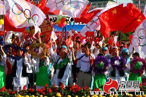 在新月广场,各族群众身穿民族服装为奥运加油,为中国加油。