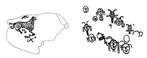 在这座山壁上,从上到下刻满了人面像,是贺兰口面积最大的“圣像壁”,有近60个人面像和30多个动物和符号,图形都十分清晰。这两个人面像面部轮廓线之内的五官构成一个人的形象,是生殖崇拜的产物。远古人很崇拜生殖巫术,这是当时人们改造自然、企求人类繁衍、动植物繁殖的需要。坎坷的人生经历,使他们意识到,冥冥之中有一种超自然的“力”在为难他们,这就是祖先的灵魂,灵魂主要 集中在头部,为了实现人口繁衍、动植物旺盛,他们不得不“迎合”和“抚慰”这个灵魂,人面像便成为灵魂的寄存之所,无穷无尽的生殖力便渊源于此。