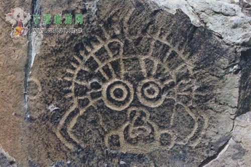 贺兰山最有代表性的一幅岩画“太阳神”。这幅太阳神岩画是贺兰山岩画中的精品,它磨刻在距地面40余米处的石壁上,头部有放射形线条,面部呈圆形,重环双眼,长有睫毛,炯炯有神,看上去很威武。这就是古代游牧民族心目中的“太阳神”。在远古时代,人们把畜牧的丰收、水草的丰茂,都归功于苍天的恩赐;而年景不好,缺吃少穿,则认为是上天对人类的惩罚。太阳高居天体之上,主宰万物,所以人们特别信仰太阳,便把太阳人格化,刻划成现在这个样子,表示对太阳的崇拜。也有人说这是古代部落首领的头像,一些有功于氏族部落的首领也往往会被刻在石壁上,成为人们崇拜、祭祀的对象。