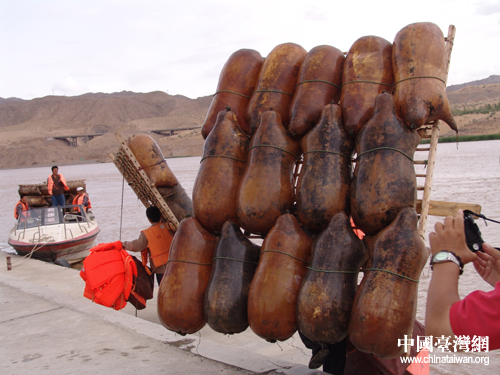 7月10日,在宁夏参加“海峡两岸记者联合采访活动”的两岸记者一行参观游览沙坡头旅游区治沙工程。图为记者乘羊皮筏在黄河漂流。
