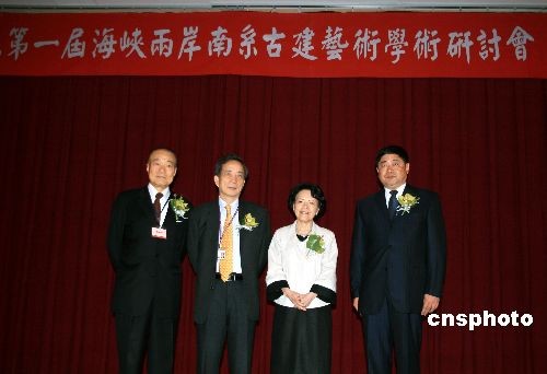 11月25日,第一届海峡两岸南系古建艺术学术研讨会在台湾艺术大学举行。国家文物局局长、中华文物交流协会会长单霁翔(右一)、台湾“文建会主委”黄碧端(右二)一起出席会议,两岸文物界高层在专业领域进行互动。中新社发 周兆军 摄
