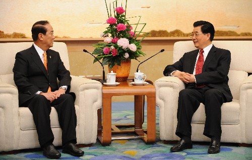 8月8日,中共中央总书记胡锦涛在北京人民大会堂会见前来出席北京奥运会开幕式和相关活动的中国国民党荣誉主席连战。 新华社记者 刘建生 摄
