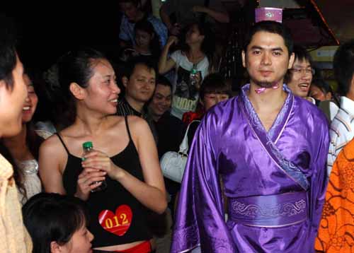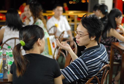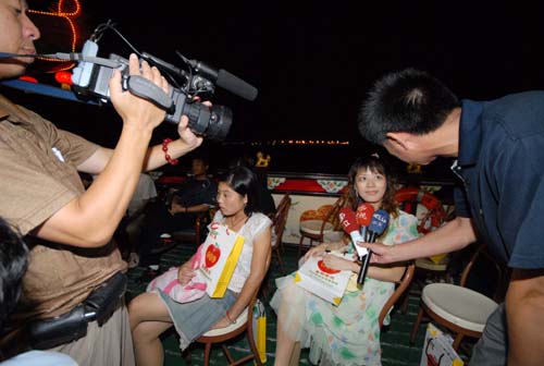 红队11号的漂亮小姐,受到众男士青睐。最早给11号写传情卡片的绿队23号帅哥,1米75左右的个,脸长得很有型,头发被摩丝打得油光发亮,特有精神。他说,自己一上船对红队11号特有感觉。此时的红队11号,对面正坐着一个人高马大的黄队78号,两人聊得甚欢。当绿队队长受委托把绿队23号的卡片送至红11号时,黄队78号甚是惊讶且略带“恼怒”,并当场微笑“叫战”:“哪位帅哥来抢我美女,叫他来坐在我旁边(比试比试)!”逗得红队11号忍笑不止。而绿队23号,因为羞涩,显得怯场,直等到黄队78号离开,才与红队11号见面开聊。