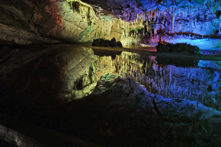 水洞“小三峡”两岸奇峰耸峙,怪石狰狞,河水夏日冰冷彻骨;干洞和迷津洞内钟乳石保存完好,奇形怪状,千姿百态,巨柱擎天、长龙横卧、雄鹰高踞,帷帽低垂,百步天梯,水镜仙境,美不胜收。不过,龙麟宫最让人震惊的景观是里面的魔幻倒影,在一处平静如镜的水面上,倒映出大峡谷、兵马俑、美女宝马等景观,美仑美奂。肖进安 摄