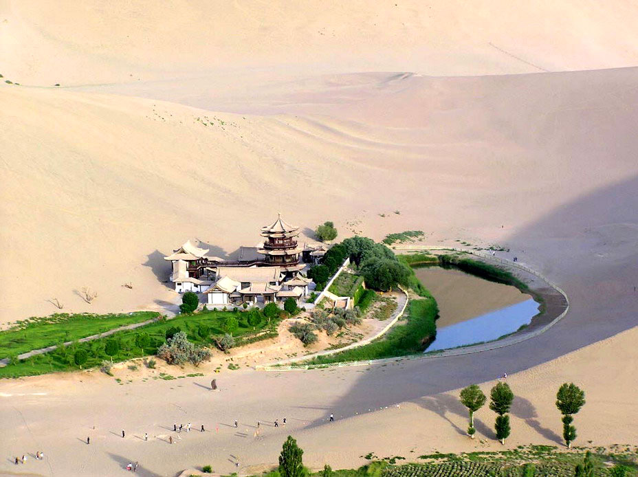 月牙泉,古称沙井,俗名药泉,自汉朝起即为“敦煌八景”之一,得名“月泉晓澈”。月牙泉南北长近100米,东西宽约25米,泉水东深西浅,最深处约5米,弯曲如新月,因而得名,有“沙漠第一泉”之称。一弯清泉,涟漪萦回,碧如翡翠。泉在流沙中,干旱不枯竭,风吹沙不落,蔚为奇观。历代文人学士对这一独特的山泉地貌,沙漠奇观称赞不已。