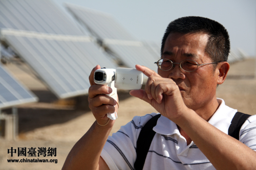 台湾记者刘朝发在敦煌市太阳能产业园区拍摄。(中国台湾网 郜利敏 摄)