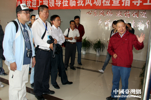 中国水电顾问集团总经理陈登平向两岸媒体记者详细介绍了瓜州县新能源发展和风电机组运行以及风能输送方式等情况。(中国台湾网 郜利敏 摄)