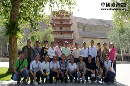 2012年海峡两岸新闻媒体“陆上三峡行”采访团在敦煌莫高窟合影。(中国台湾网发)